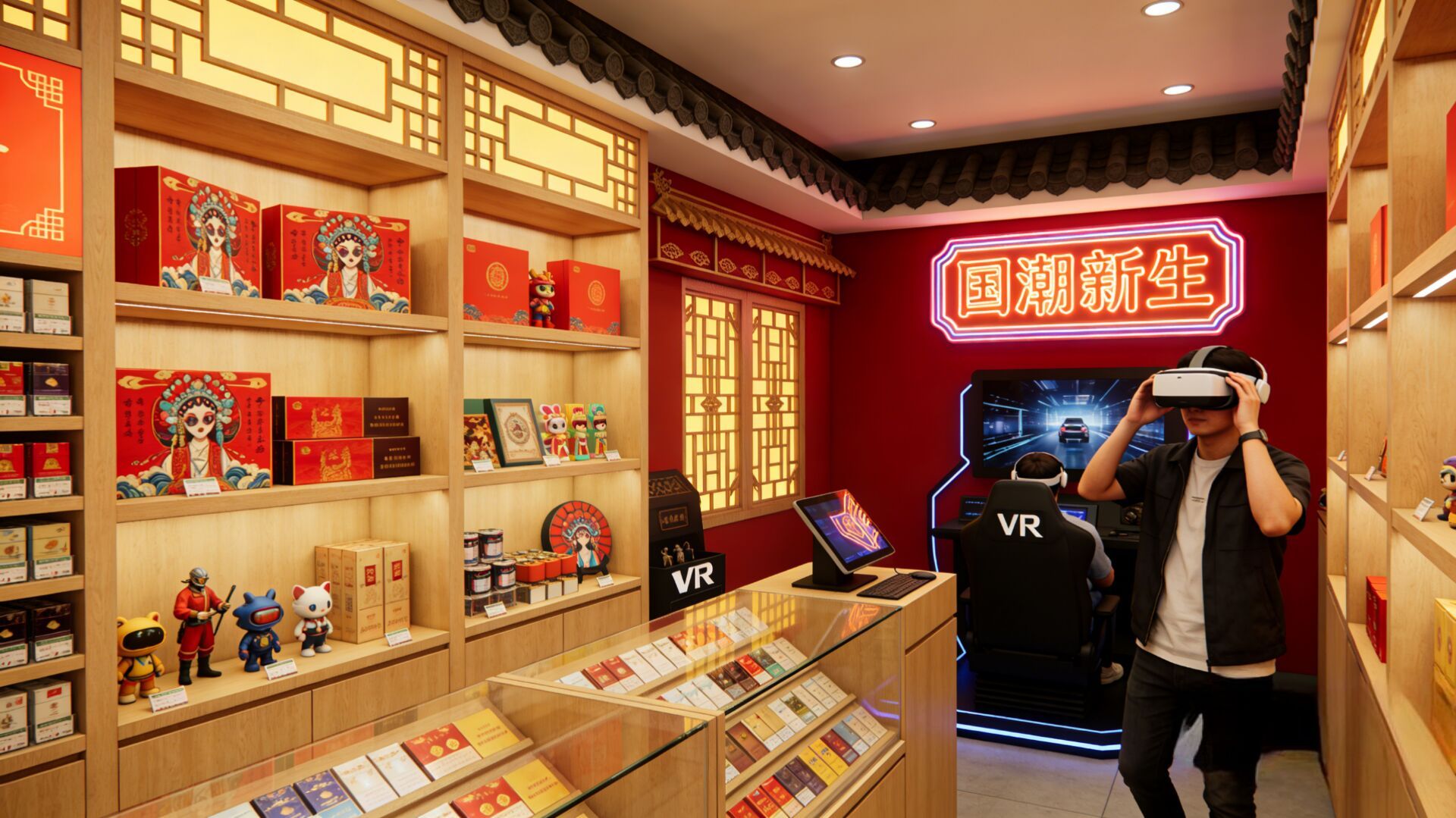 店內(nèi)可劃分出卷煙陳列區(qū)、潮品售賣(mài)區(qū)和體驗(yàn)區(qū)三大區(qū)域:卷煙區(qū)擺放國(guó)潮風(fēng)包裝的卷煙及聯(lián)名禮盒;潮品區(qū)搭配售賣(mài)國(guó)潮風(fēng)的潮玩、文創(chuàng)周邊、特色飲品;體驗(yàn)區(qū)單獨(dú)劃出一塊小區(qū)域做VR體驗(yàn)區(qū),讓消費(fèi)者戴上VR眼鏡,不光能“走進(jìn)”優(yōu)質(zhì)煙草種植園,看到大片綠油油的煙葉地,還能了解國(guó)潮文創(chuàng)產(chǎn)品的設(shè)計(jì)過(guò)程??勺灾鲗?duì)接國(guó)潮設(shè)計(jì)師或小型文創(chuàng)品牌,聯(lián)名推出限定款禮盒和配套潮品,禮盒包裝印滿(mǎn)潮流插畫(huà)元素,兼顧顏值與文化感。