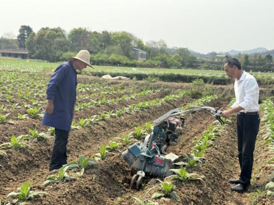 圖為:葉坪煙站煙技員指導(dǎo)煙農(nóng)利用培土機作業(yè)