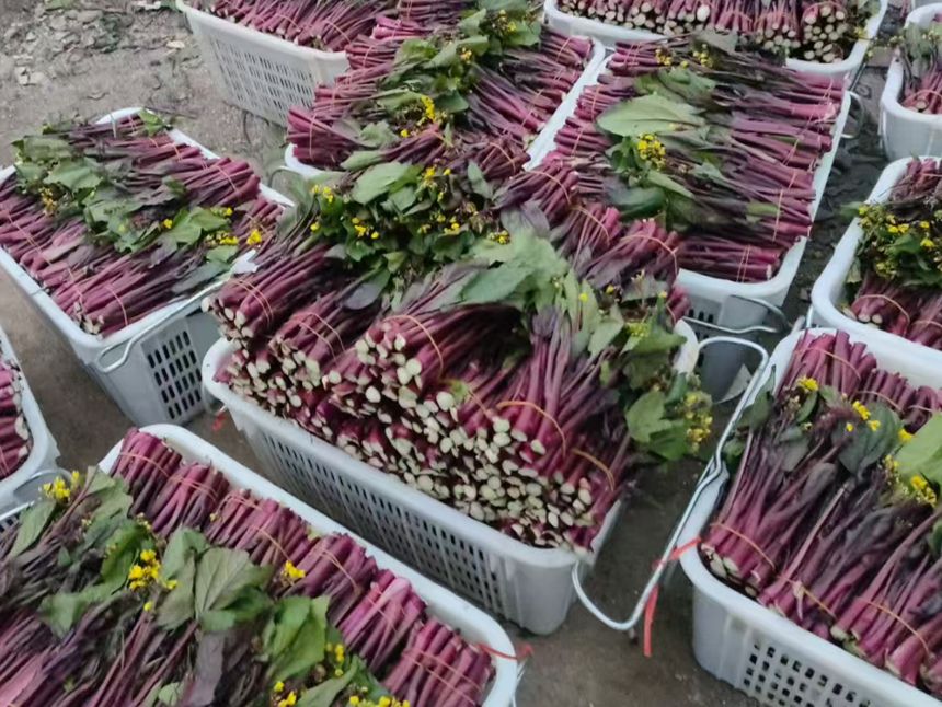 在產(chǎn)銷銜接環(huán)節(jié),產(chǎn)業(yè)模式盡顯高效優(yōu)勢。紅菜苔種植周期內(nèi)可采收30至40次,單次采收量約10公斤,農(nóng)貿(mào)公司采取“現(xiàn)場交售、集中運輸”模式,以每公斤10元的市場均價現(xiàn)場收購,隨后統(tǒng)一運往廣州、深圳等珠三角地區(qū)農(nóng)貿(mào)市場批發(fā)零售,打通從田間到市場的“綠色通道”。據(jù)測算,該產(chǎn)業(yè)畝產(chǎn)量可達300至400公斤,總產(chǎn)值區(qū)間為1837.5萬元至2450萬元,為農(nóng)戶帶來可觀收益。