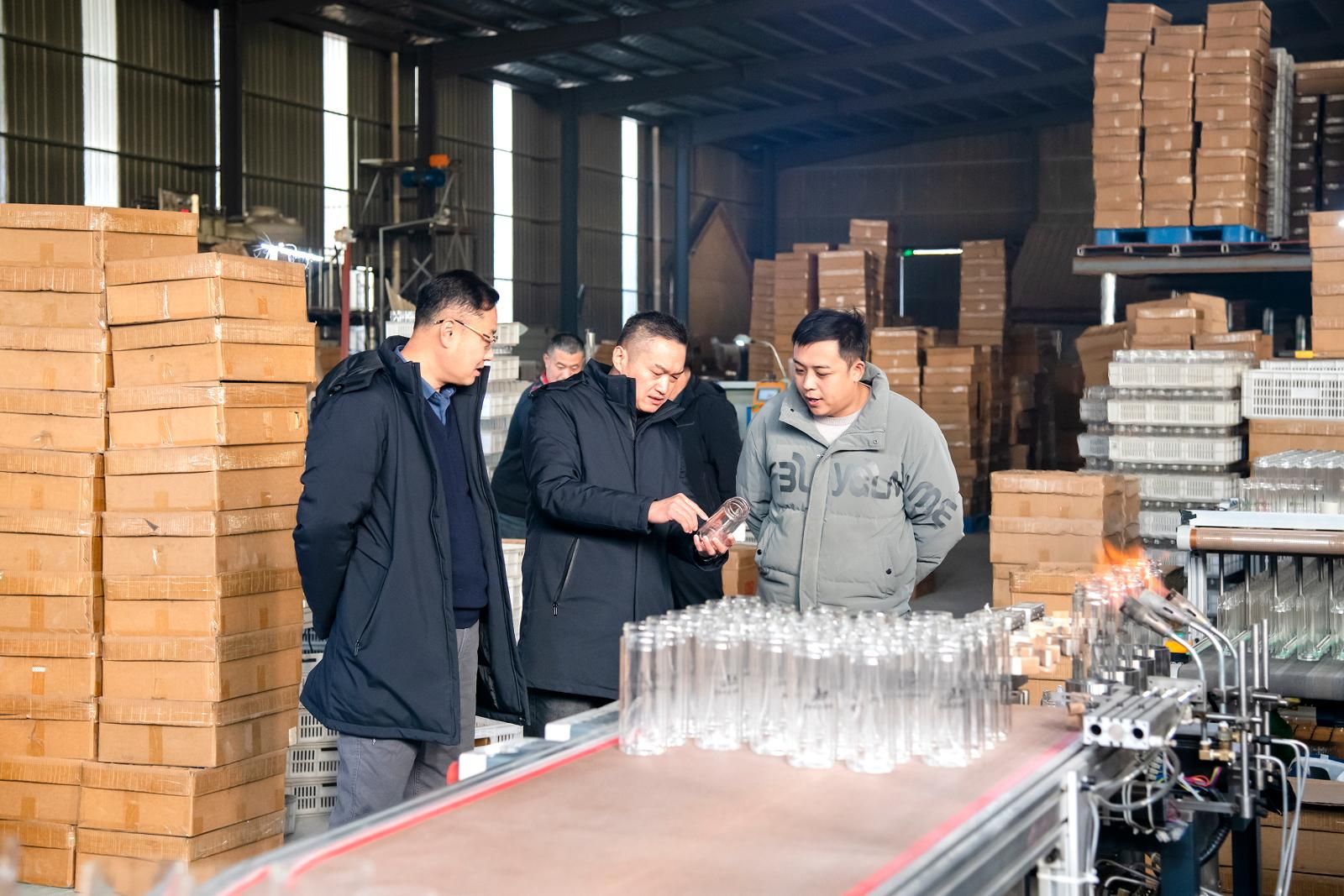 孫濤(中)在頤騰玻璃制品廠了解磁吸式水杯的生產(chǎn)工藝及銷路。劉靜攝