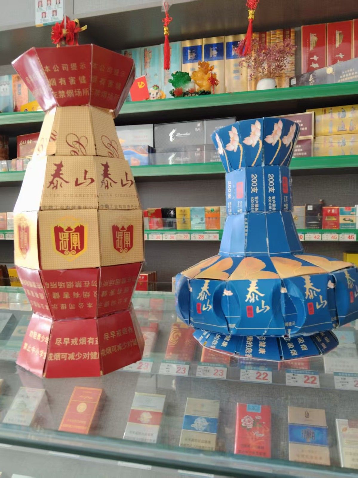 在劉志云看來,煙標(biāo)本身就是文化載體。她剪“囍” 字時,會融入“紅雙喜”煙標(biāo)的經(jīng)典紋樣;剪“春”字時,借鑒卷煙陳列的造型靈感。2024 年國慶,她特意用“中華”“利群”等煙盒的紅色底紋,剪出迎風(fēng)飄揚(yáng)的五星紅旗,煙盒上的“百年傳承”字樣與剪紙的五角星相映,成了超市里最特別的節(jié)日裝飾。